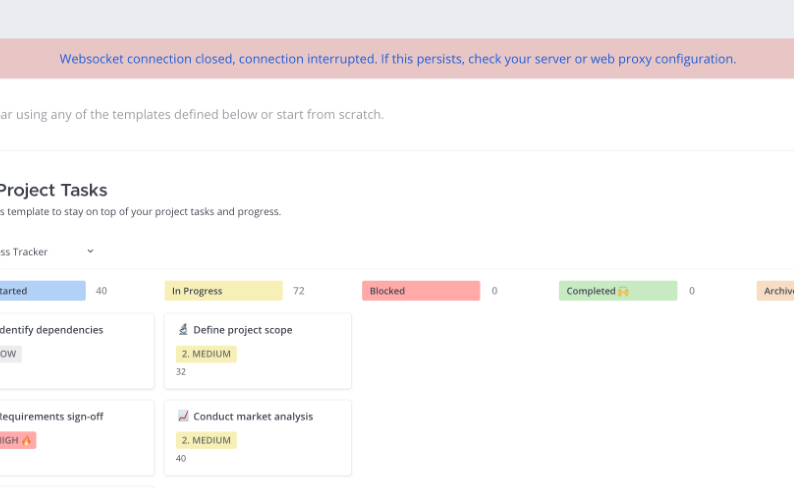 チャンネル(プロジェクト)やタスクをクリックしても何も起きない。タスクの新規作成はできるが編集はできないなど、部分的にできることできないことがあり、明らかに壊れている様子でもある。いろいろと検証した結果、これは「Boardsのインターフェースは立ち上がっているが、WebSocket通信が失敗していて機能していない状態」だろうということが分かった。以下に対処方法を記録しておく。